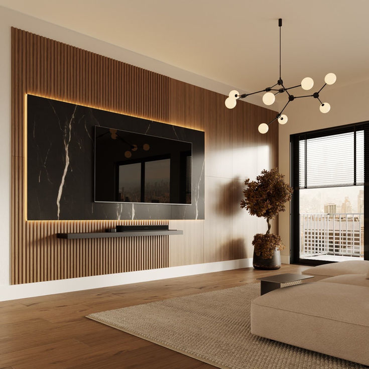 The Brickell Design Wall System is one of the most sophisticated wall systems available, seamlessly combining rich wood textures with elegant stone paneling. It incorporates a modern slatted design and subtle, warm LED lighting to highlight the TV area, creating a luxurious focal point for any interior.