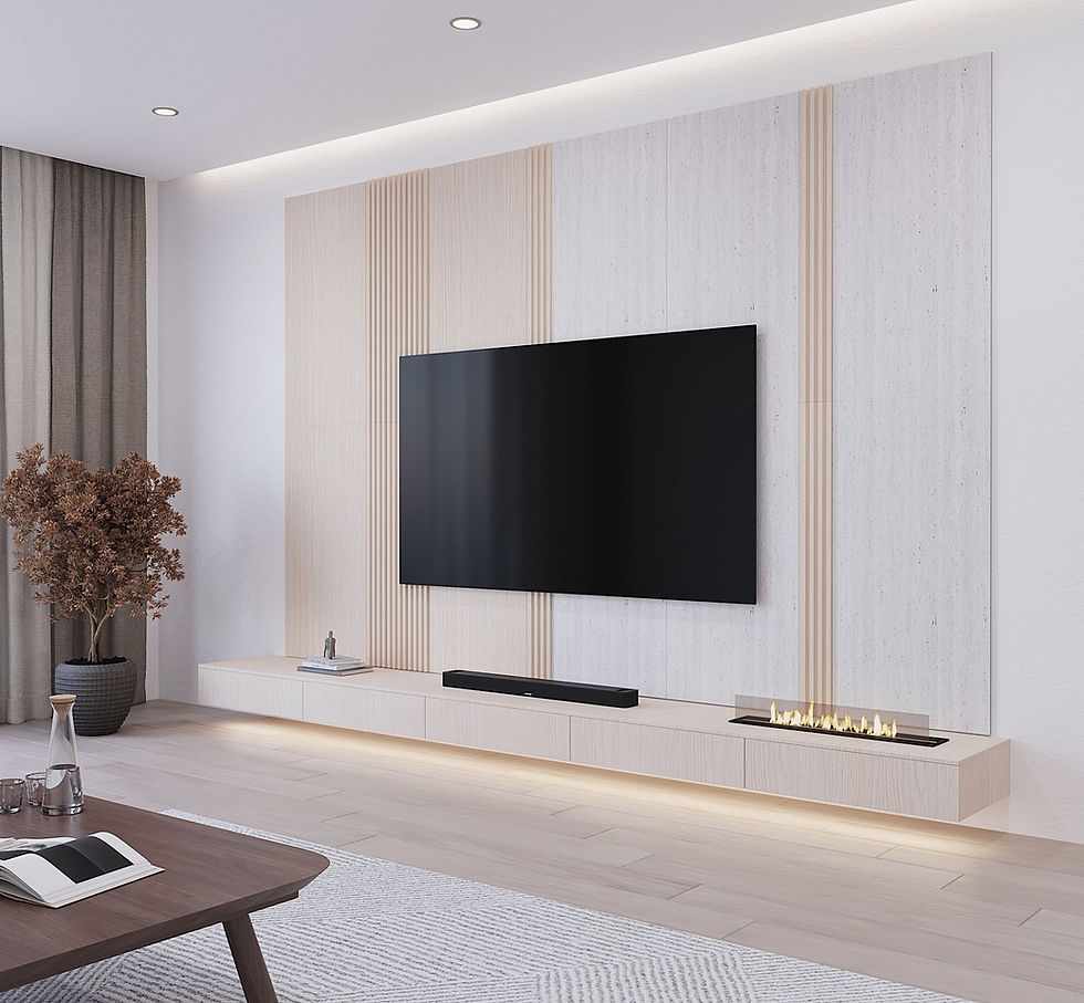 Textured flex stone panels rise like illuminated columns between warm wood planks for a dramatic, tactile backdrop. The contrast reads luxurious yet natural, catching daylight and LEDs beautifully. Durable, wipe-clean surfaces keep the wall looking fresh while the vertical rhythm visually heightens the room.